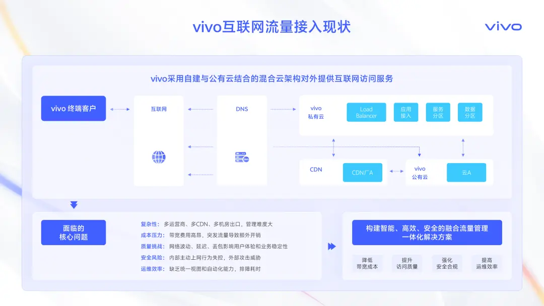 vivo採用了自建私有云和公有云結合的混合雲架構。用户的訪問流量,會通過DNS、CDN、負載均衡等一系列網絡基礎設施,最終到達我們的業務服務。