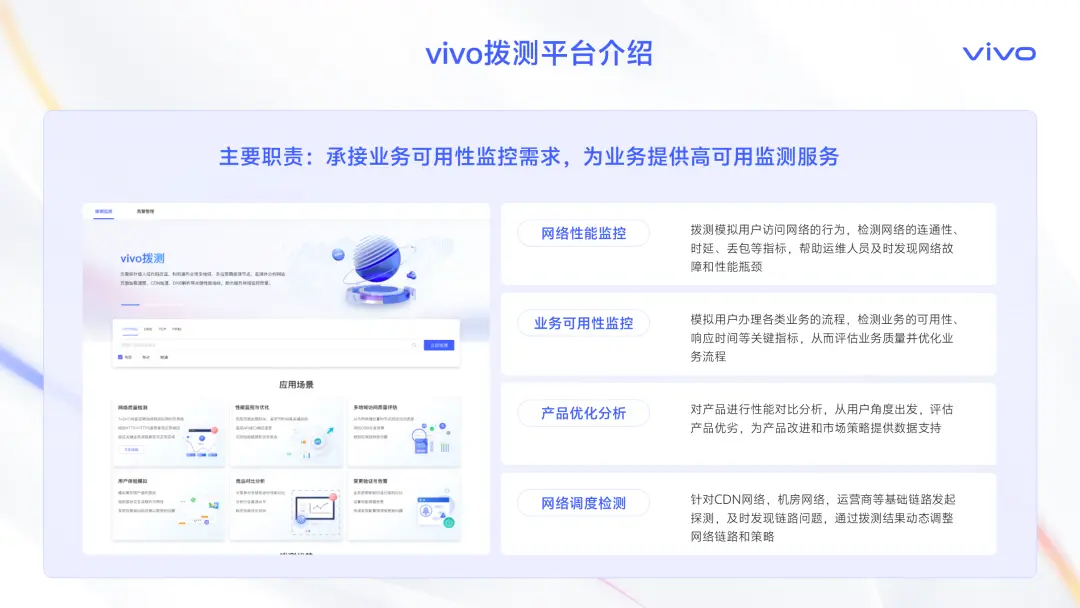 在vivo,撥測的核心使命,就是為所有業務和產品高可用保駕護航,網絡性能監控、業務可用性監控,產品優化分析、這是基礎能力,確保我們的服務穩定可靠。