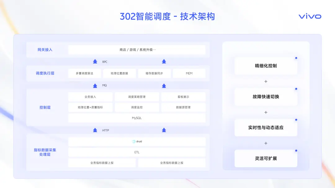 我們通過ETL、Druid等大數據技術,對海量的業務指標數據進行實時處理。 在控制層,我們有靈活的調度策略管理和多重調度算法。