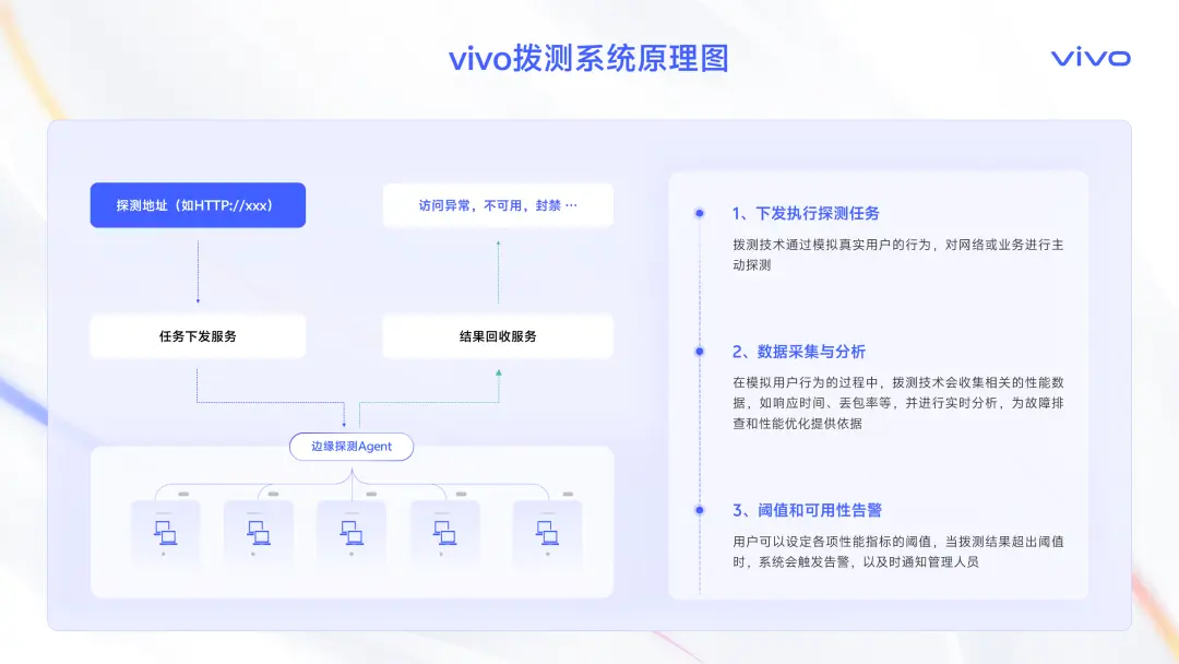 瞭解了vivo自有節點規模後,那麼撥測如何工作的?下面這張圖清晰展示了vivo撥測系統的基本工作原理,它主要分為三步