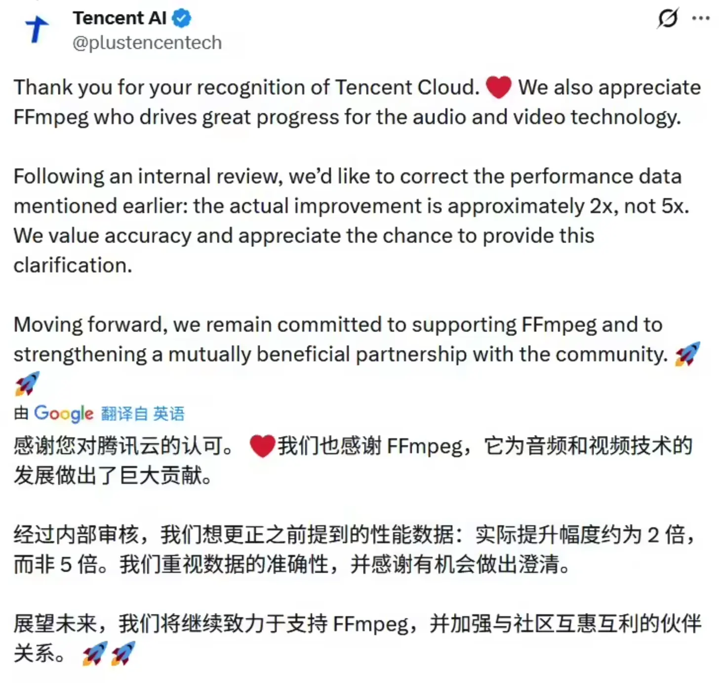 知名開源多媒體框架 FFmpeg 在社交媒體公開感謝了騰訊公司向項目提交的手寫 ARM 彙編補丁,稱比 C 快 5 倍: