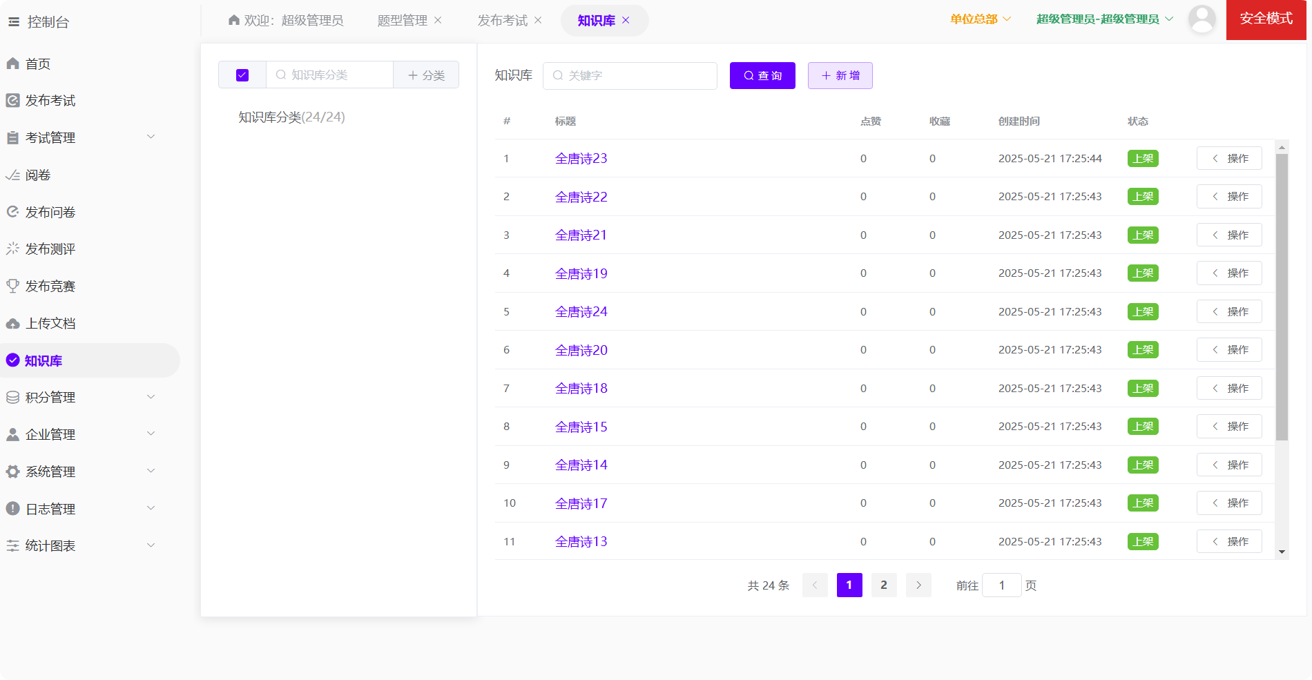 發佈考試:發佈、保存、重新發布試卷,支持正式考試、模擬自測模式。