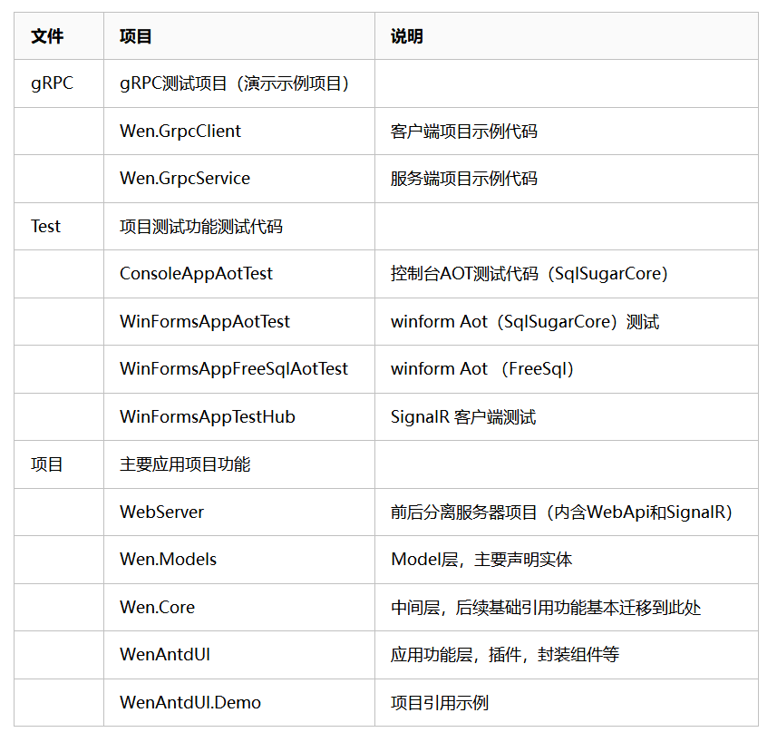 WenAntdUI 項目的主要模塊及其對應的功能説明,涵蓋了從示例測試到核心應用的各個組成部分,便於大家瞭解項目結構和功能分佈。