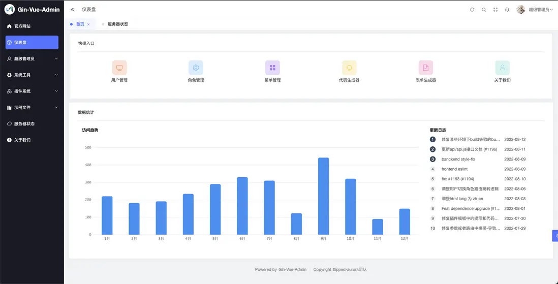 GIN-VUE-ADMIN是一個基於vue和gin開發的全棧前後端分離的開發基礎平台,擁有jwt鑑權,動態路由,動態菜單,casbin鑑權,表單生成器,代碼生成器等功能,提供了多種示例文件,讓大家把更多時間專注在業務開發上。