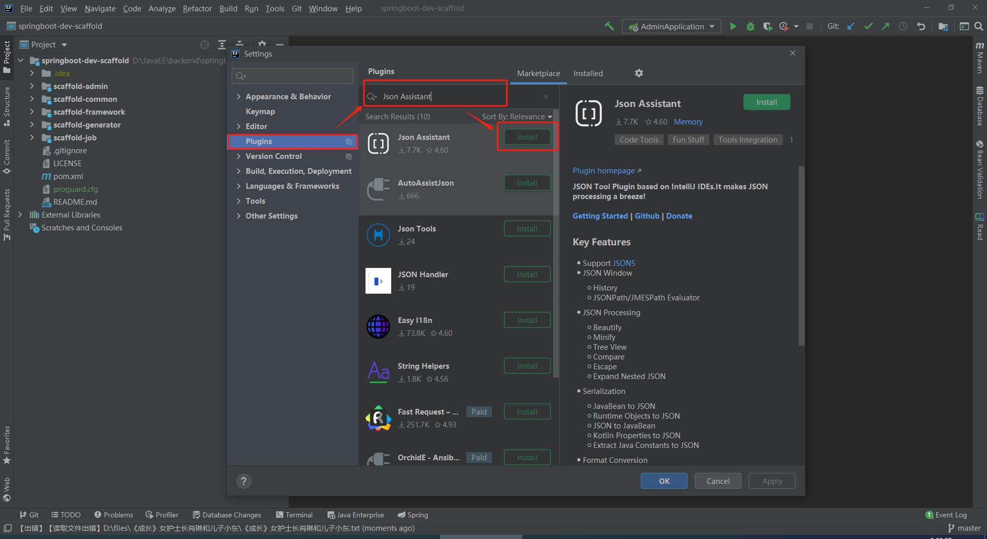 2、插件市場搜索框中輸入Json Assistant,從搜索結果中找到該插件,點擊Install安裝插件,安裝完成後重啓 IDEA