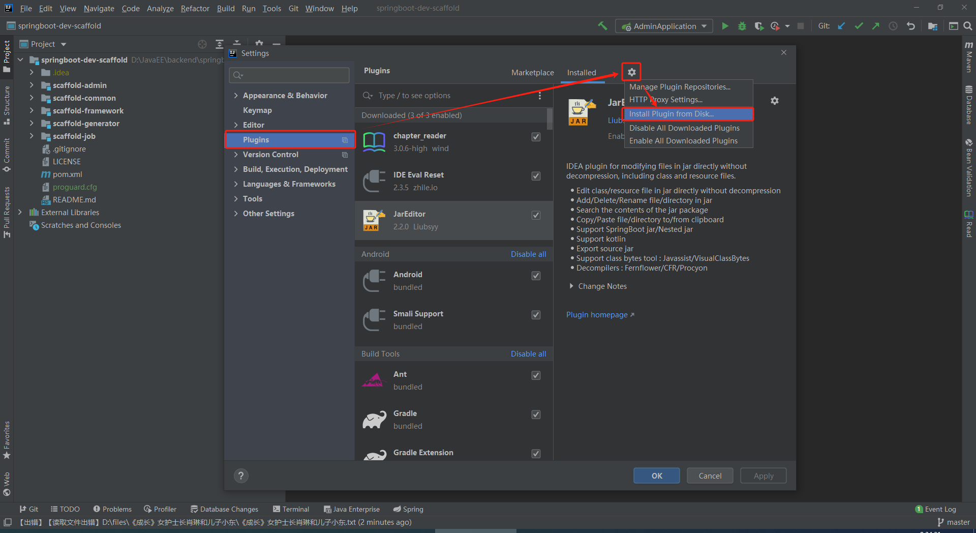 2、打開 IDEA 插件中心,並選擇從本地磁盤安裝,安裝完成後重啓 IDEA