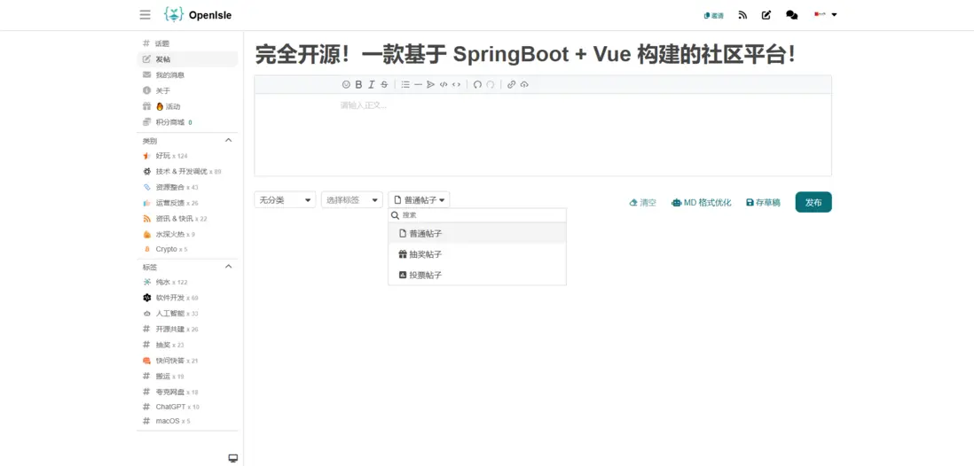 OpenIsle —— 一個使用 SpringBoot 和 Vue3 構建的全棧開源社區平台,提供用户註冊、登錄、貼文發佈、評論交互等完整功能,可用於項目社區或直接打造自主社區站點。