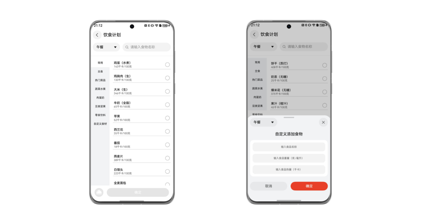支持制定飲食計劃的食材,也可以自定義食材並填寫熱量。