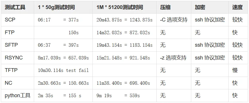 - 小文件傳輸速率:python 工具 > NC > FTP > RSYNC > SFTP > SCP 。