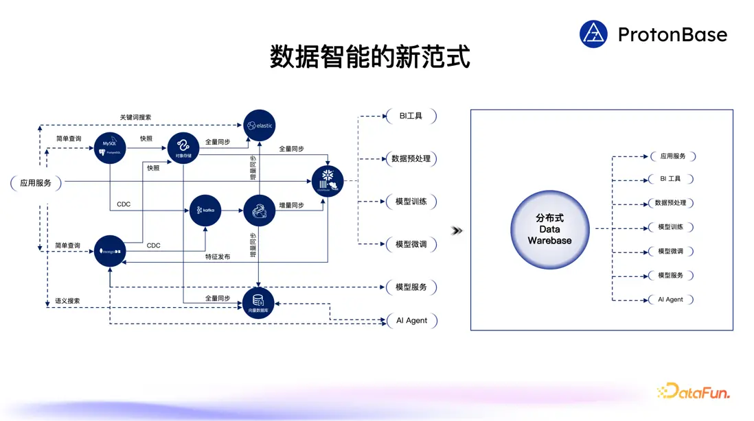 基於以上介紹的新一代技術路線和性能要求標準,ProtonBase 構建出一類全新的數據產品:分佈式 Data Warebase。Data Warebase 這個詞是 Data Warehouse 和 Database 這兩個詞的組合,它意味着 Data Warebase 同時具有了 Data Warehouse 和 Database 的所有能力和優勢。