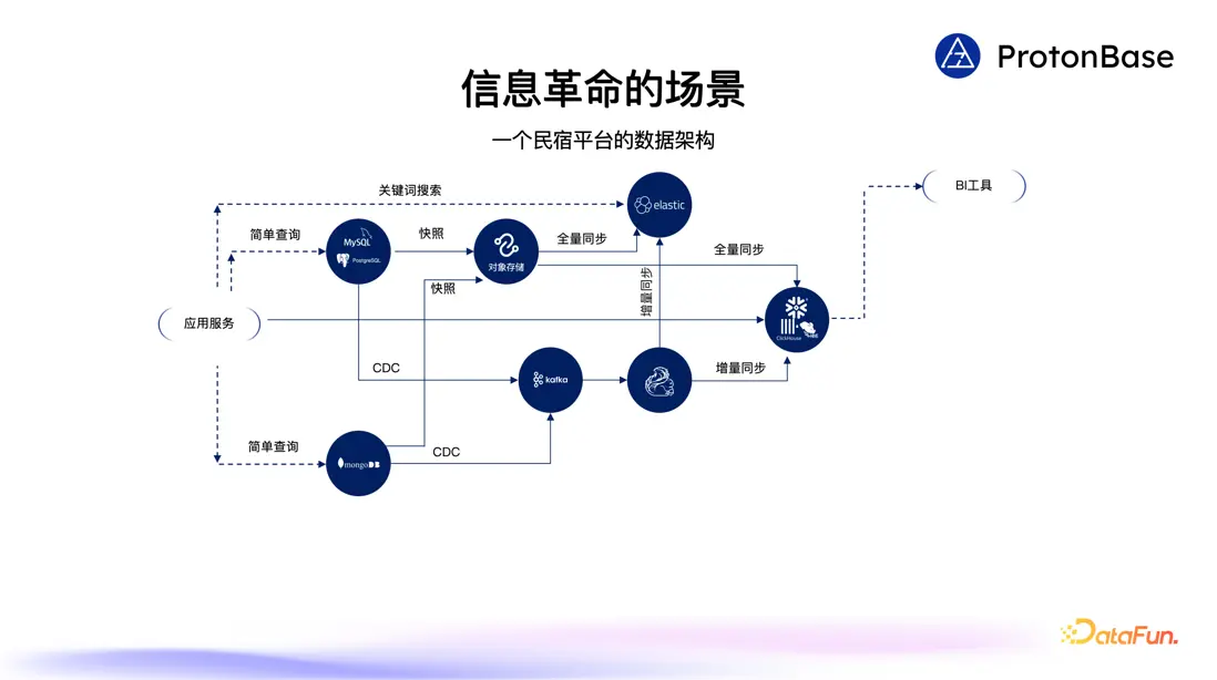 接着業務用户量開始迅速上升,用户需求也越來越多元,用户不再侷限於通過全名的方式去查找民宿,而是希望能夠根據一些關鍵詞找到自己感興趣的民宿,在這方面 MongoDB 提供的能力相對有限。於是系統引入 ElasticSearch,因為其提供了強大的搜索能力,採用內存數據處理使得查詢速度非常快,可以達到近乎實時的數據處理。為了讓搜索引擎能夠提供搜索服務,首先需要把數據導入到搜索引擎之中。數據的導入一般分為兩種形式,第一種是全量數據導入,關係型數據庫和 NoSQL 數據庫裏面的數據會定期以全量的方式導入搜索引擎。第二種是增量數據導入,如果應用對數據的時效性有比較高的要求,還要再引入增量的數據同步鏈路,比如採用 Kafka 和 Flink 這樣的技術把上游的增刪改同步到搜索引擎之中。當搜索引擎有了這些數據後,就可以為應用提供高性能的關鍵詞搜索了。