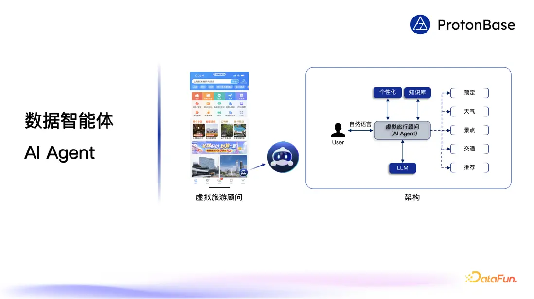 簡單總結一下,生成式 AI 和業務數據結合有四種方式:上下文學習、向量搜索、整合了向量搜索和上下文學習的檢索增強生成即 RAG、模型微調。在實際的應用中,往往會把這幾種方式結合在一起,還可能使用外部的工具,我們把這類智能的應用叫做數據智能體,即 AI Agent。