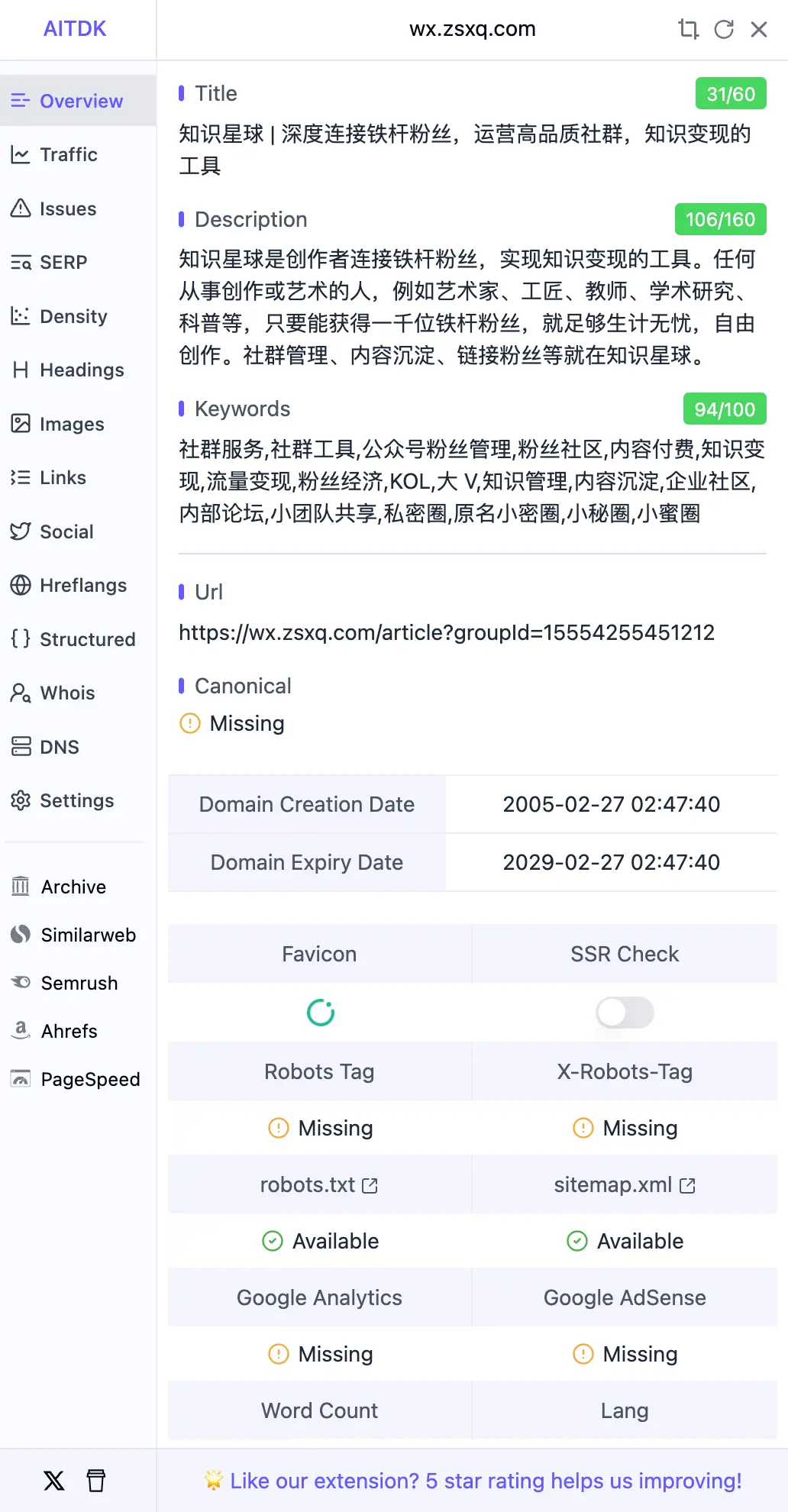 • Overview:它可以檢查一系列網頁相關的源數據(但這部分不一定對,因為有的頁面是純scr)。