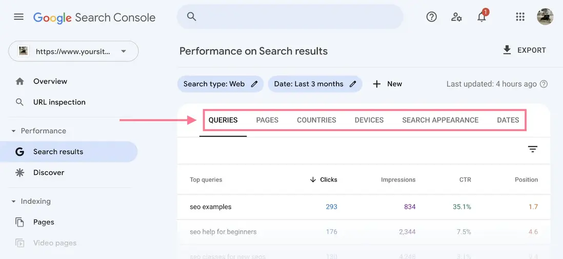 性能報告提供了我們網站在Google搜索中的表現數據。它顯示了四個關鍵指標:
