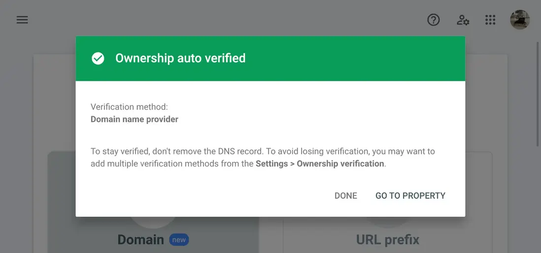 你需要把這個TXT記錄加到你的DNS服務商的解析裏面去,當添加完了域名解析這時候就直接點擊Verify(可能要等等,因為dns需要傳播)。完成後有個這樣的彈窗。