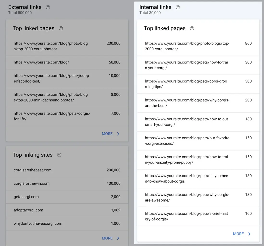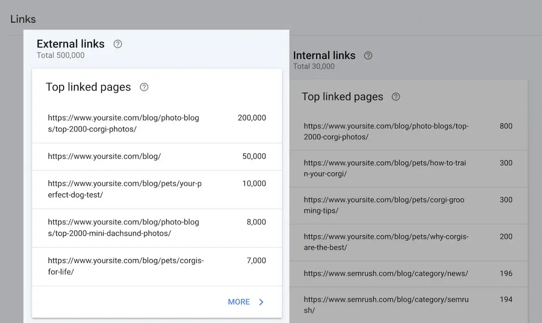該報告還顯示了我們網站上哪些頁面有最多的內部鏈接,即來自我們自己域的頁面的鏈接。