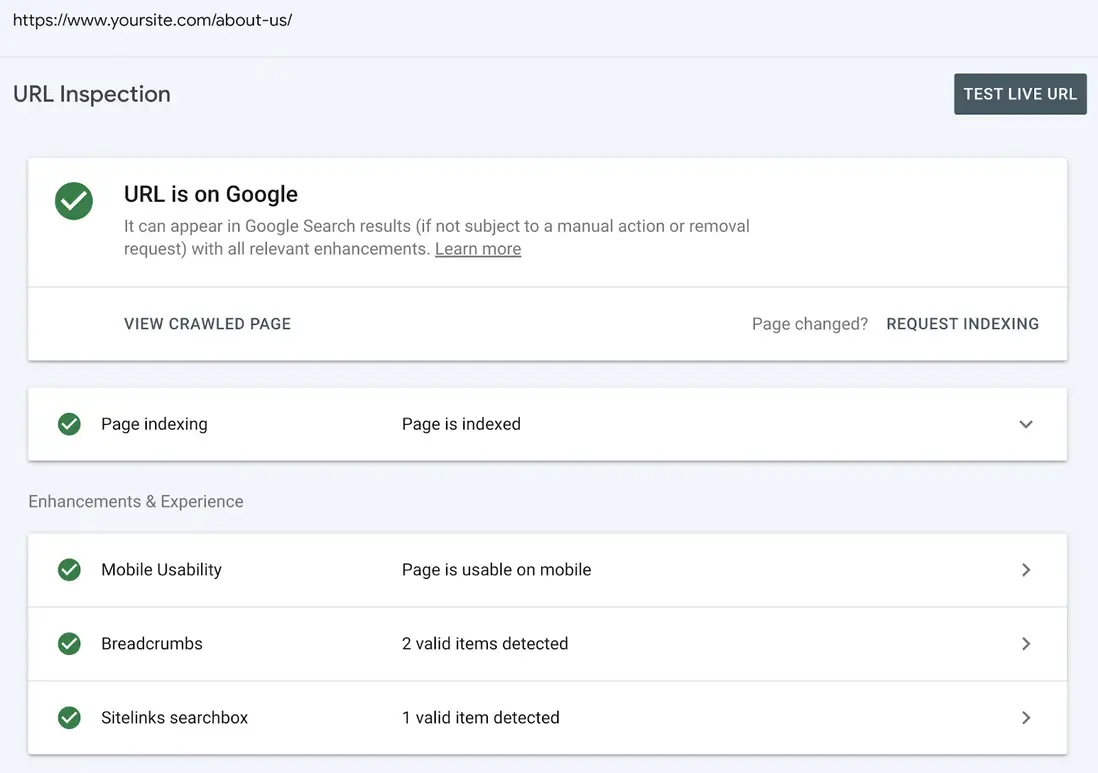 URL檢查工具可以幫助我們檢查單個頁面的索引狀態,並解決可能阻止頁面出現在Google搜索結果中的問題。我們可以: