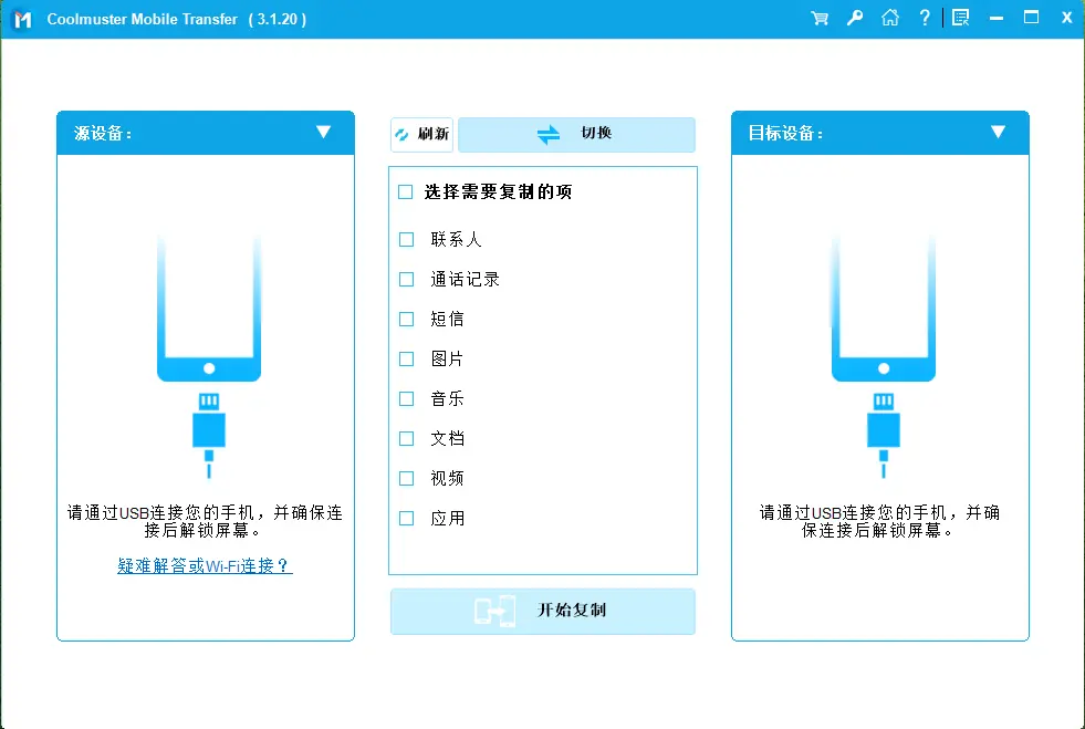 03勾選“音樂”選項,點擊“開始複製”。等待傳輸完成,您的音樂將自動出現在您的iQOO上。