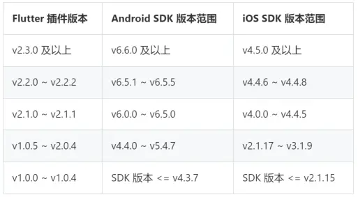 ●Flutter 插件與 Android 和 iOS 對應的 SDK 版本關係如下:
