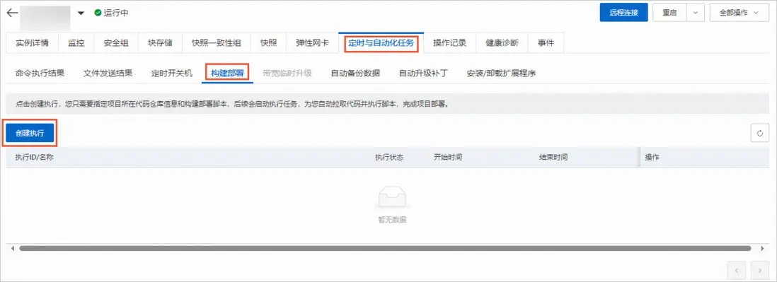 - 在<font style="color:#117CEE;">ECS管理控制枱</font>,找到想要部署到的ECS實例,點擊進入詳情頁。在定時與自動化任務裏找到構建部署。