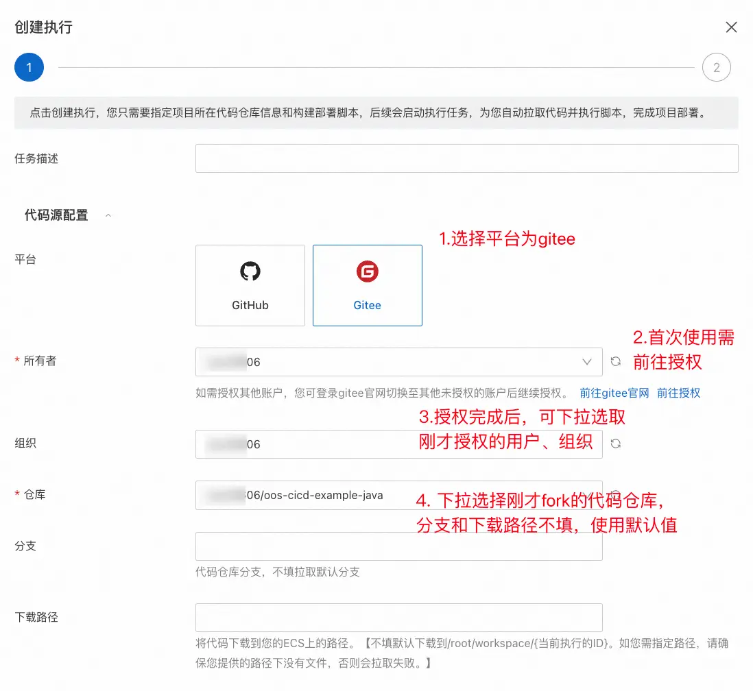 - 點擊創建執行,填入代碼源配置和構建部署配置相關信息。
