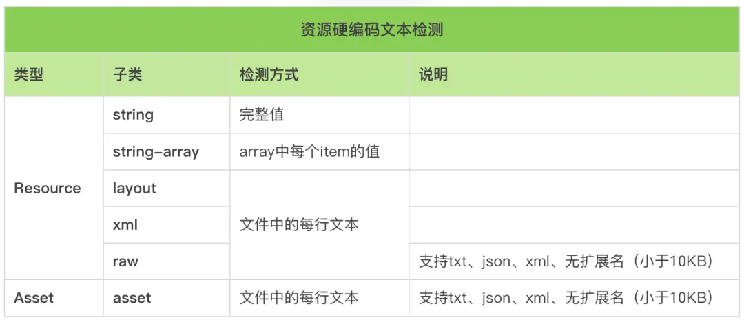 對於這類問題,開發了對應檢測能力,可以自定義正則表達式,對上述資源中硬編碼文本進行匹配。檢測結果中,按照模塊、資源進行逐級聚合。支持以下類型資源中的字符串文本:
