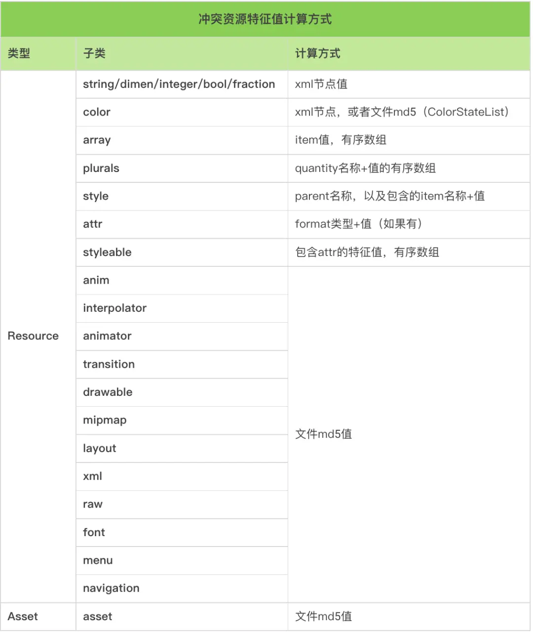 在上述檢測結果中,當同名資源在同一配置下,超過兩個模塊包含此資源值時,才可能發生衝突,因此也才會進行資源特徵值計算,否則會顯示為not calculated。不同類型資源的特徵值計算方式如下: