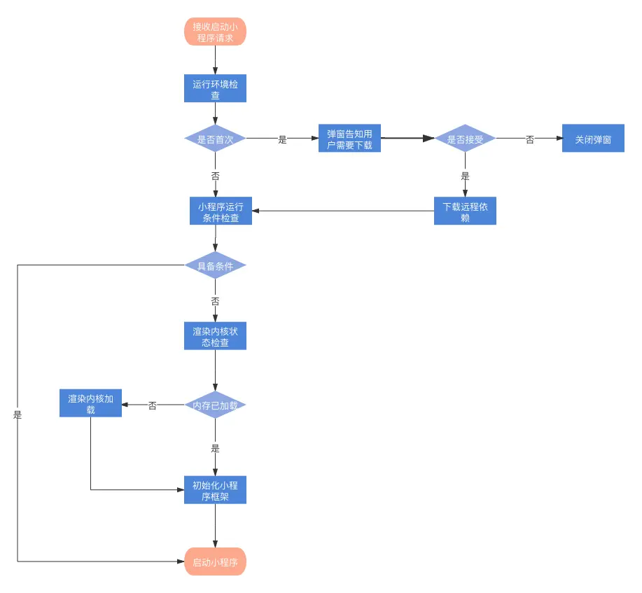 最終加載小程序頁面的是渲染內核,當運行條件檢查發現不具備運行條件,也就是冷啓動小程序時,就必須先判斷渲染內核是否已經加載完成 (需注意:渲染內核不止小程序一個業務依賴,有可能被其他業務先加載)。