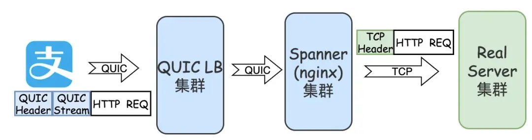 如下為我們落地架構的示意圖,支付寶手機客户端通過 QUIC 攜帶 HTTP 請求,通過 QUIC LB 等四層網關將請求轉發到 Spanner (螞蟻內部基於 NGINX 開發的 7 層網關),在 Spanner 上我們將 QUIC 請求 Proxy 成 TCP 請求,發送給業務網關(RS)。