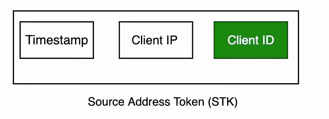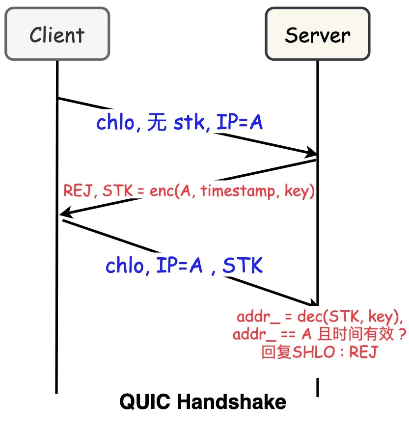 - Client 下次握手的時候,將 STK 攜帶過來,由於 STK 無法篡改,所以 Server 通過自己的 KEY 解密,如果解出來的地址和客户端此次握手的地址一致,且時間在有效期內,則表示客户端可信,便可以建立連接。