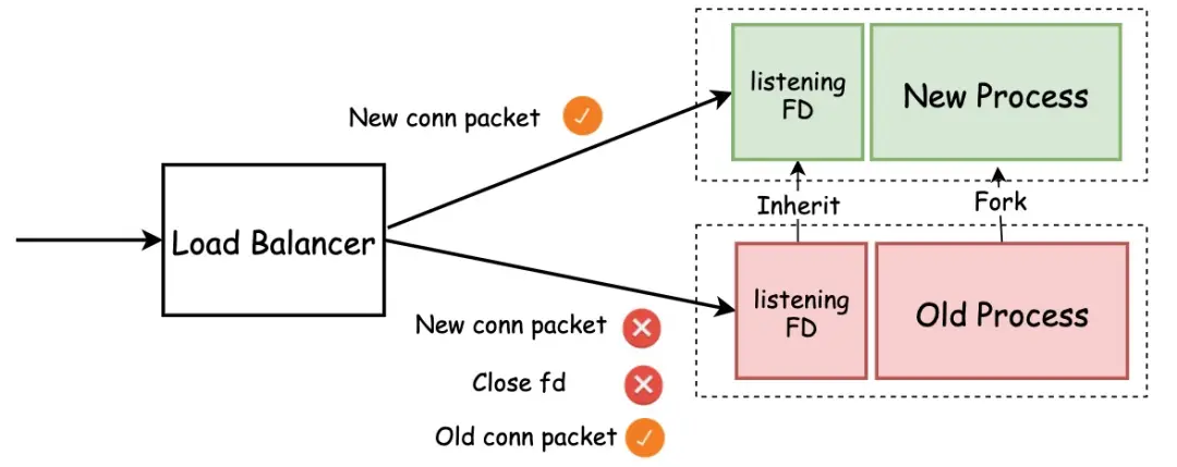 - 而 old process 此時如果關閉 listenging socket, 則在途的數據包便無法接收,達不到優雅退出的目的;