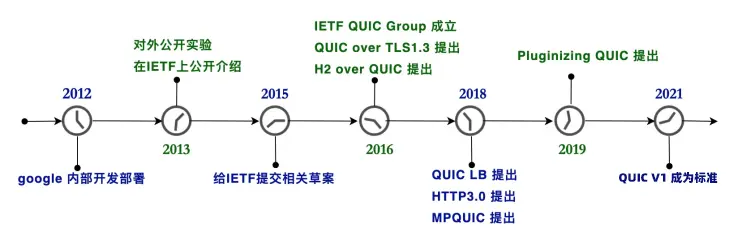 下圖是 QUIC 從創建到現在為止的一些比較重要的時間節點,2021 年,QUIC V1 成為 RFC,結束百花齊放的態勢。