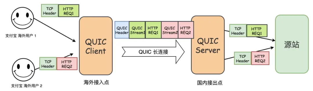- 通過 QUIC 長連接的上的 Stream 承載 TCP 請求,避免每次的跨海建聯;