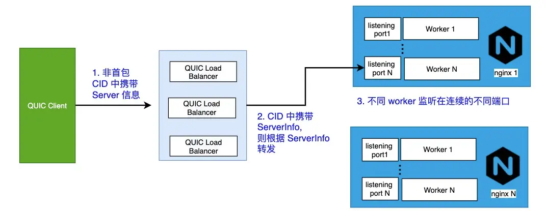 - 無論是否連接遷移,QUIC LB 都可以根據 ServerInfo,將報文轉發到正確的進程;