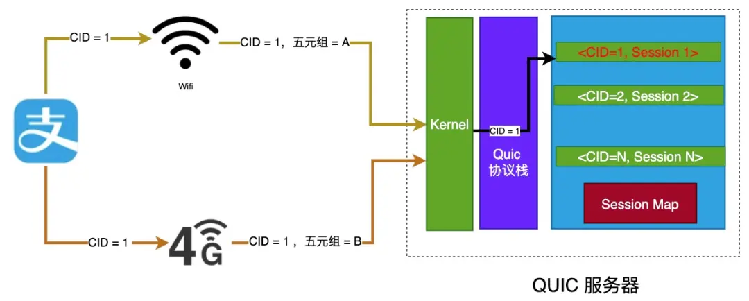 如下圖所示,是 QUIC 支持連接的一個示意圖,當客户端出口地址從 A 切換成 B 的時候,因為 CID 保持不變,所以在 QUIC 服務器上,依然可以查詢到對應的 Session 狀態。