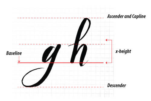 - X-height: This refers to how tall each letter is. Think of the lowercase x. From the bottom (baseline) to its top, that space is called the x-height. Your lettering can have uniform x-height, or you can play with making some letters with a small x-height and others with a large x-height.