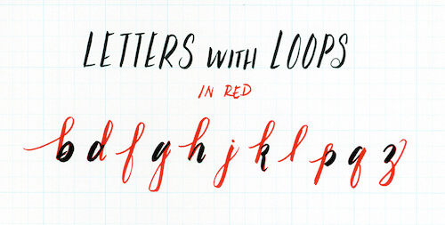 Remember when we talked about ascenders and descenders on the b, d, f, g, h, k, l, p, q, and the cursive z? Well, creating an extended loop that will either go beyond the x-height or below the baseline will form those ascenders and those descenders. On the ascenders, your brush will go up first. Therefore, it will be a lightweight stroke. Conversely, on the descenders, your brush pen will make a downward stroke that will be thick. As you are turning the brush to go up again, the stroke will be lighter.