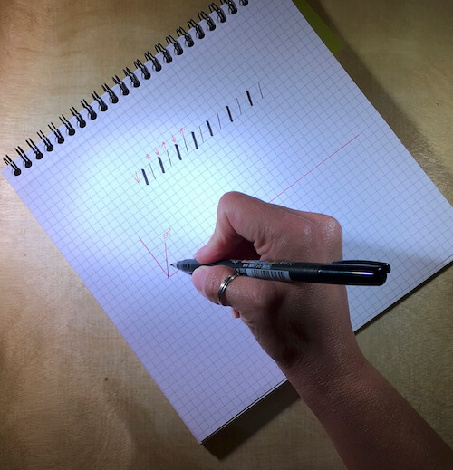 Every down or diagonal stroke that goes towards the baseline will be thick. You will create that thickness by slightly changing the pen’s angle and adding pressure. When you move the pen towards the x-height line or the ascender line, either straight up or a diagonal, the pressure should be very light.