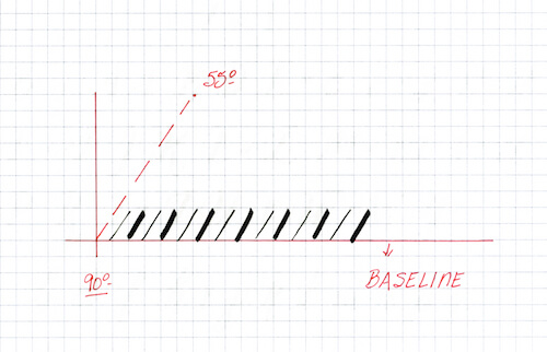 The angle in which you hold the brush will be crucial. It will affect the angle of each letter, their posture, and in general, the look of the entire word, phrase, quote, etc. Remember your baseline. If you trace a straight vertical line from the baseline, that would be a 90-degree angle, right? If you start writing with a pencil or pen, usually the slant of your letters will be about 30 to 40 degrees to the right of the vertical line we just drew. Now, in calligraphy, every calligraphic hand will be created at a specific angle, which will create a specific slant. These exact requirements are necessary to replicate that calligraphic hand with exactitude. But, in brush lettering, especially in modern brush lettering, the angle may vary. That is, you may decide to write your letters with the brush at 90 degrees, 60, 55, or 30 degrees. You are welcome to play with it and test what you like most. For instance, my natural handwriting is usually at 60 degrees from the baseline. That is where I am most comfortable because it is how my handwriting works. But, I realized after practicing this past year, when I wanted to slow down and write each letter at a time, instead of sweeping through, my letters still sat at a 60-degree slant. See diagram below.