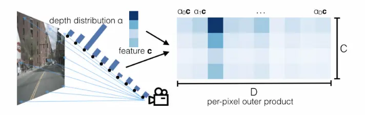 圖1‑3 LSS示意,每個特徵點生成系列離散深度點,再為深度點生成特徵[3]
