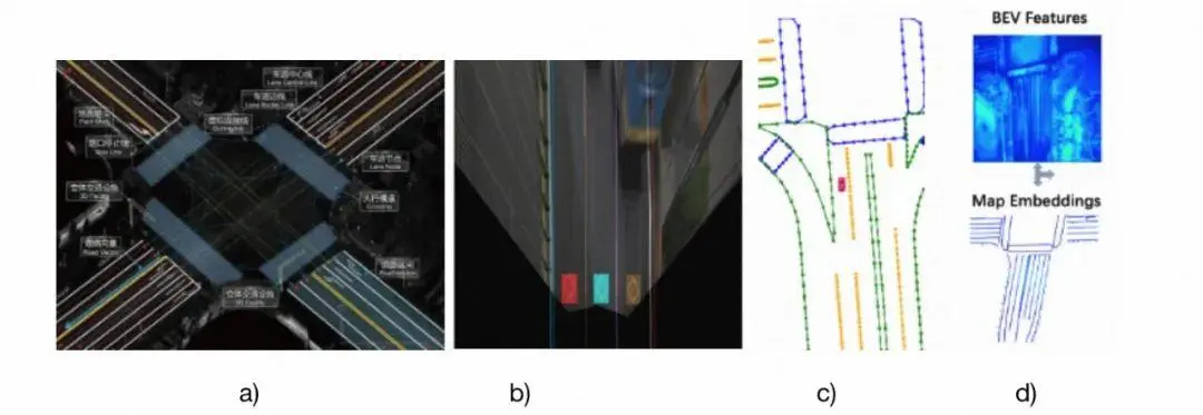 圖1‑1 BEV在高德應用場景(僅列舉部分)a)高精底圖 b)地面要素識別 c)車道線拓撲構建[1] d)車端融合定位(BEV特徵和底圖匹配)[2]