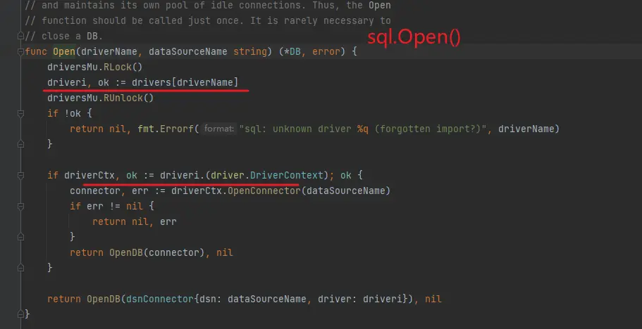 gorm.Open 中調用了 sql.Open , sql.Open 中去從全局的 map driver中獲取 mysql 字符串對應的引擎