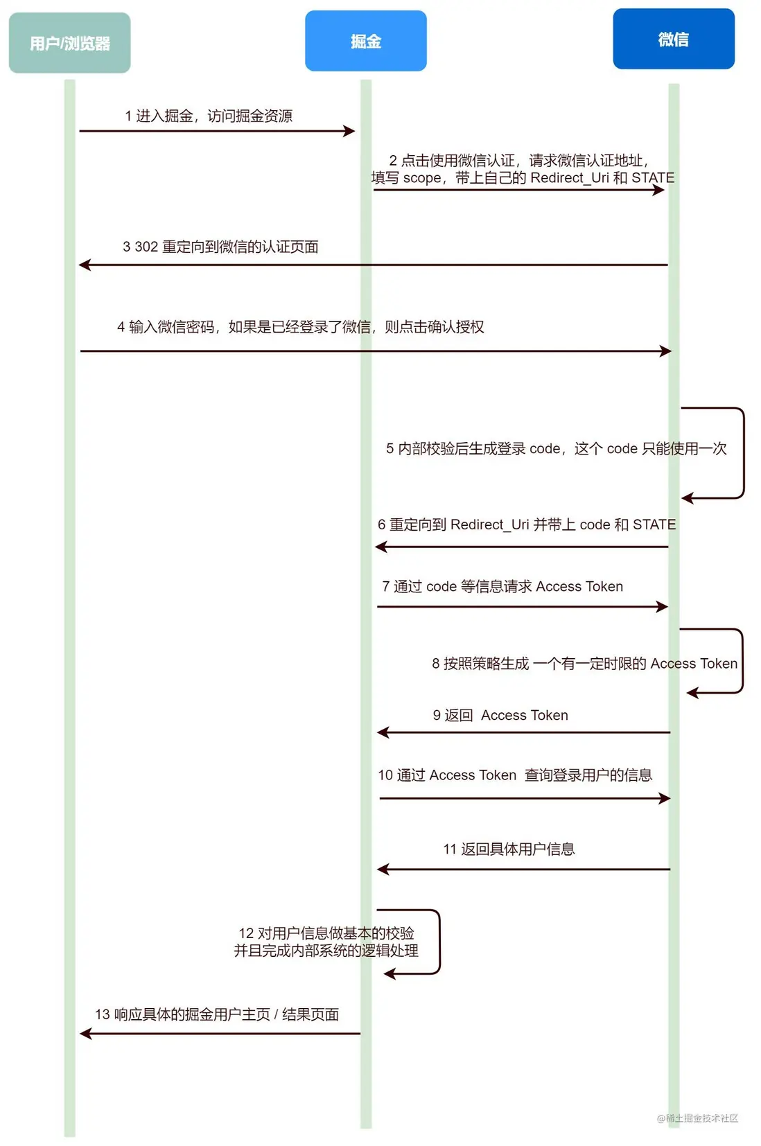 舉個例子:在掘金中使用微信認證的方式來登錄掘金,主要看大體的方向和流程