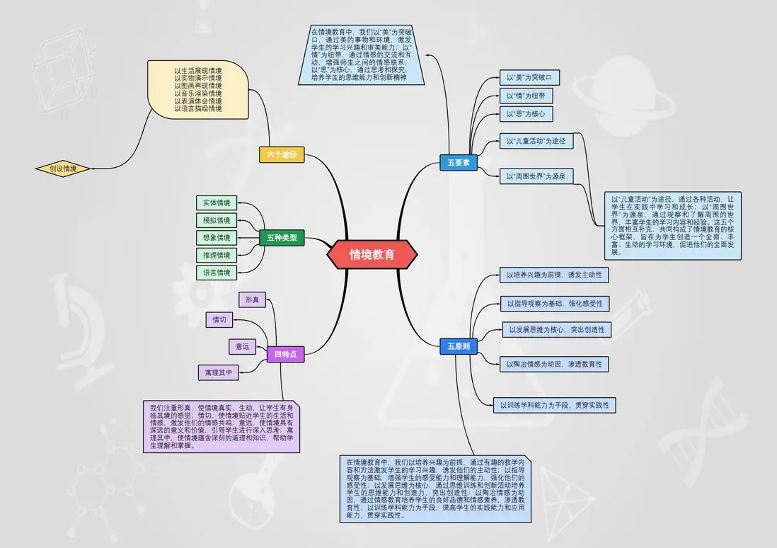 - 中心主題設置:以“情境教育”為中心主題,放置在導圖的中心位置,確保視覺焦點清晰。