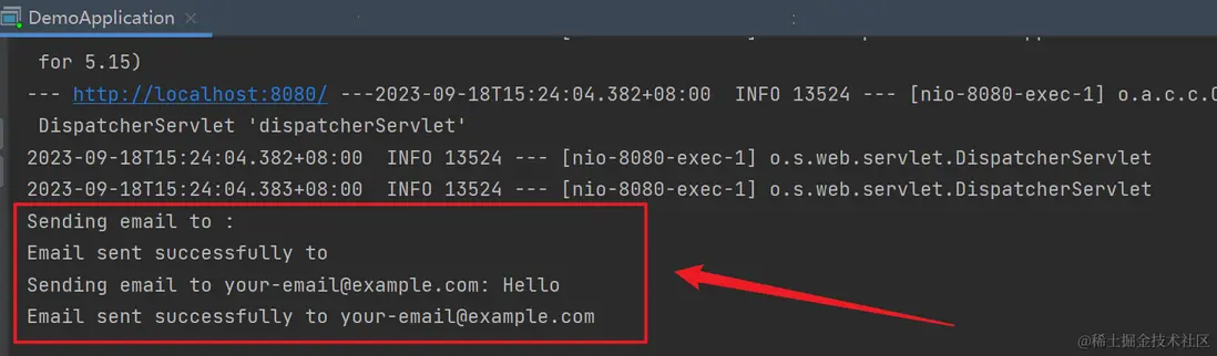 現在,你可以運行 Spring Boot 應用程序。應用程序將啓動,並且可以通過訪問http://localhost:8080/sendEmail或者http://localhost:8080/sendEmail?recipient=your-email@example.com&message=Hello來觸發電子郵件發送請求。