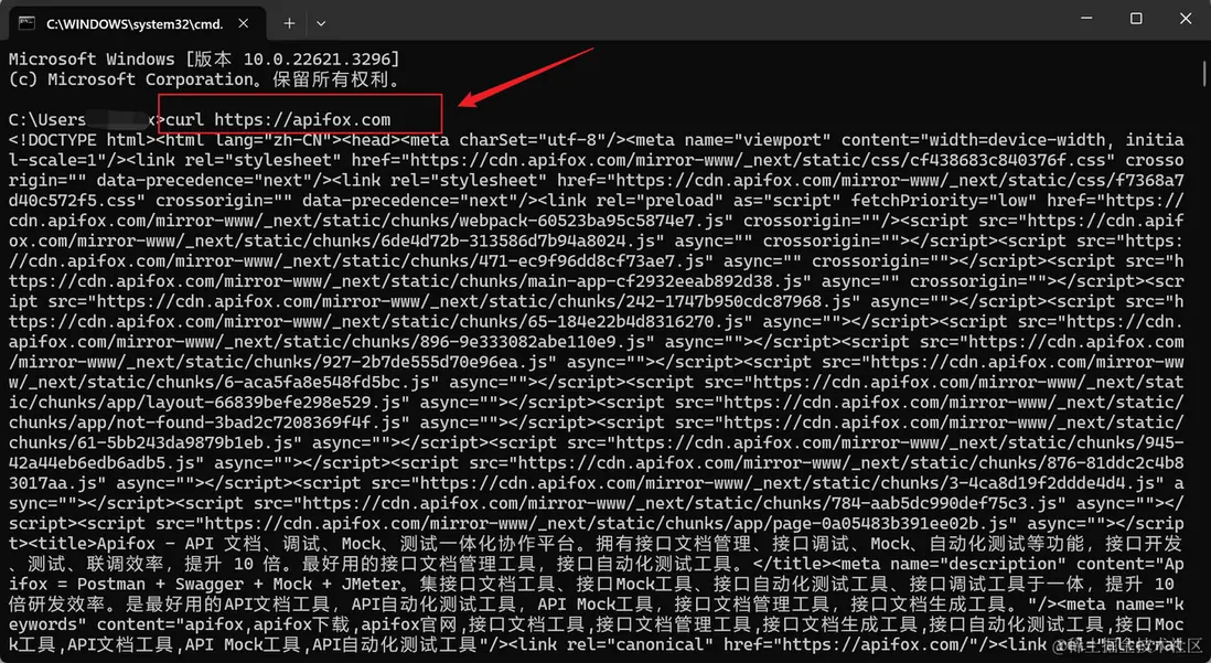 cURL 的神奇之處在於它對廣泛的協議如 HTTP、HTTPS 和 FTP 的支持,它能夠滿足幾乎所有的網絡請求需求。大多數操作系統都內置了命令行工具,方便進行 cURL 測試;例如,在 Windows 系統中,只需按下“Win + R”鍵,輸入 cmd 調出命令行,然後輸入相應的 cURL 命令並敲擊回車鍵,如 curl https://apifox.com,就能夠獲得所請求網站的數據。
