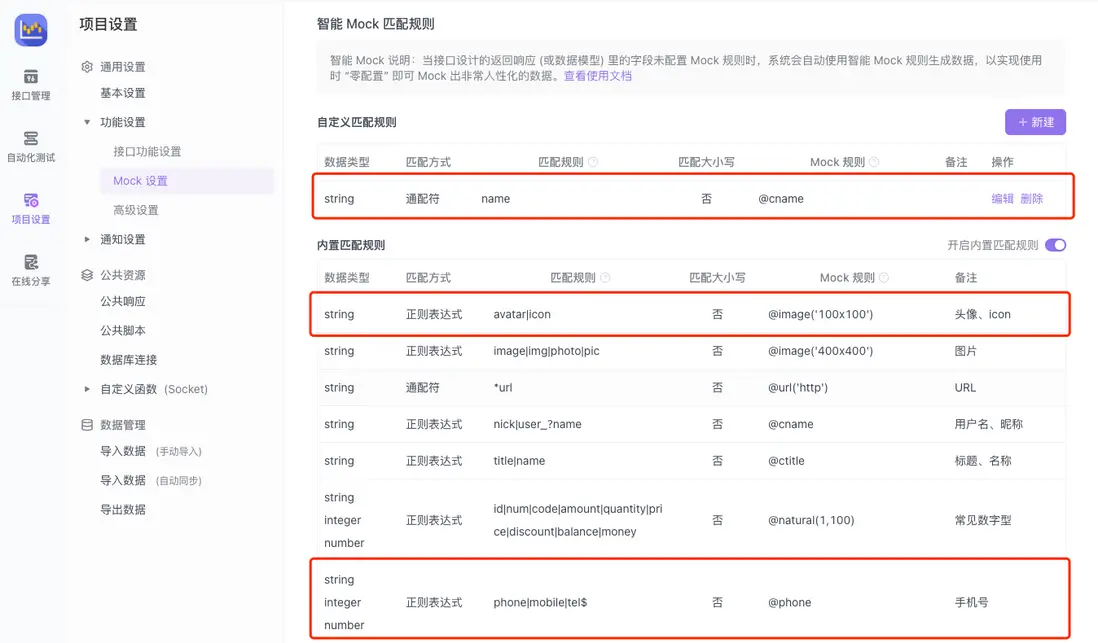 原因是,Apifox 支持給 Mock 設置了匹配規則。Apifox 內置了一些規則。用户也可以自定義規則。這些規則可以在 項目設置 > 功能設置 > Mock 設置中看到。