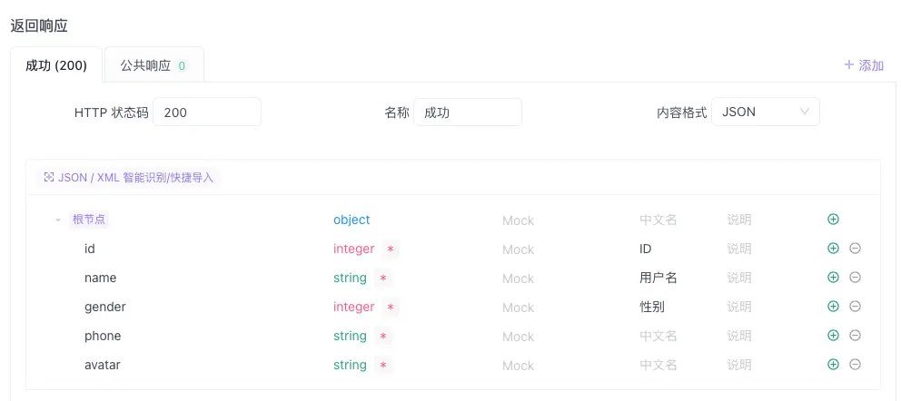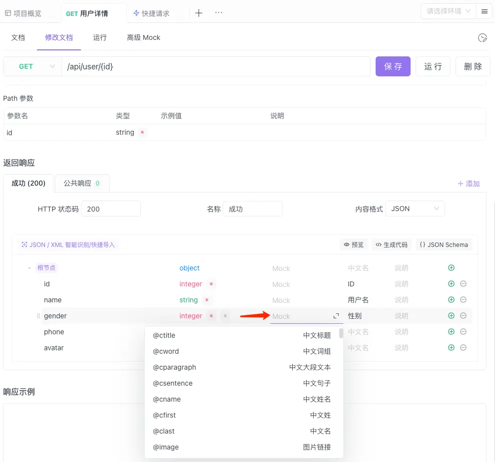 這樣,用户詳情接口就創建好了。同時,Apifox 根據響應的字段格式和類型,給我們自動創建好了 Mock。點擊 Mock 下的 “快捷請求” 按鈕可查看 Mock 的返回: