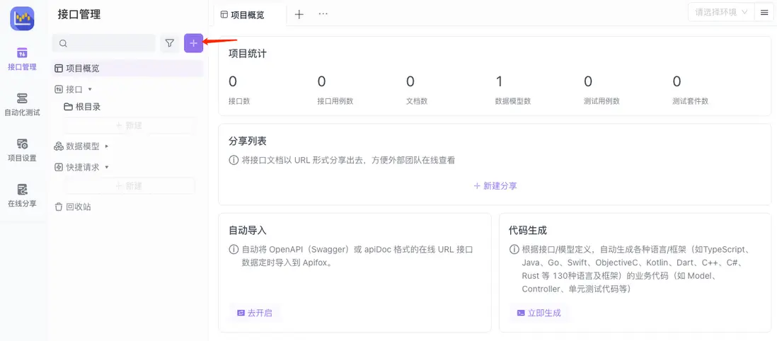 進入上一步新建項目的首頁,點擊左側的 “+” 按鈕來新建接口。