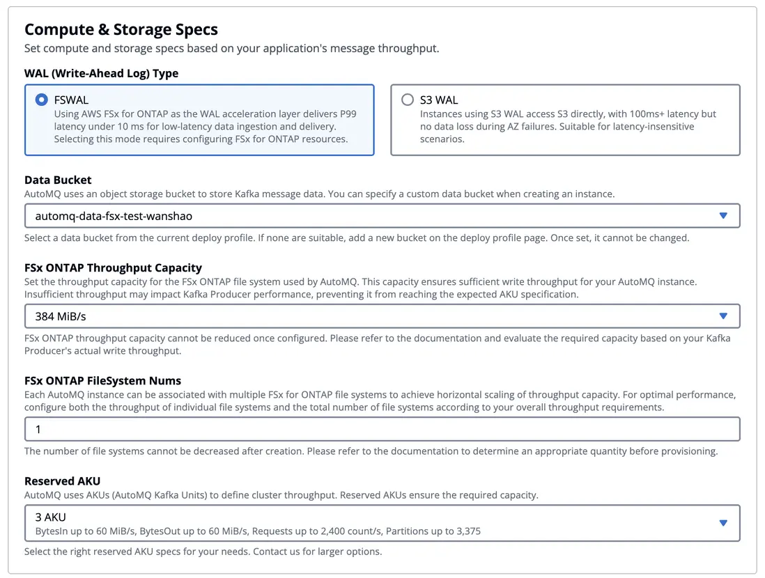 在本示例中我們選擇 FSx WAL,除了配置 AKU 之外,還需要額外選擇 Amazon FSx for NetApp ONTAP 的實例規格和數量。AutoMQ 已對不同 FSx ONTAP 實例規格進行了系統化的性能壓測與驗證,用户無需從 IOPS、帶寬、容量等維度自行做複雜規劃,只需根據目標寫入吞吐量,結合下表即可快速估算所需 FSx 實例數量。在當前配置中,我們選擇了 3 AKU(可支持 60 MB/s 的讀取與寫入),只需搭配 1 個 384 MBps 規格的 FSx 實例即可滿足 WAL 寫入性能需求。